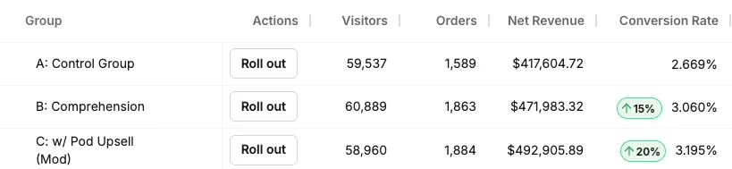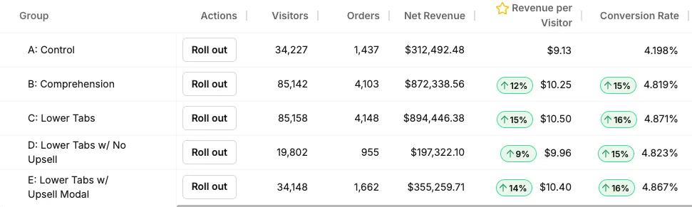 From those insights, we didn’t build 15 tests. We identified the highest-leverage experiments: recreating buy box sections (including product hero galleries) for their conversion pages. We rebuilt these sections around credibility (science-backed accuracy claims), clarity (showing what’s really changing in your body), and proof of progress (data that validates effort).